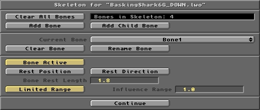 Click this button to Clear the Current Bone from the Skeleton. Only the Bone held in RAM is removed, though there is no undo for this command. Mistakes using Clear Bone will require a complete re-Load of the Scene or a re-work of the Skeleton. The Scene file held in the 3D:Scenes directory, which contains all Bones data for the Object's Skeleton, remains unaffected. Only if the Current Scene is saved will the Bones data be updated to the hard drive.