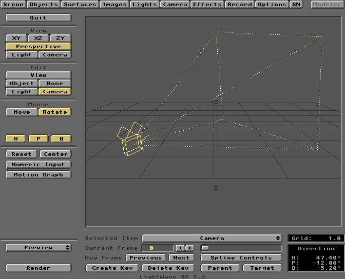 On entering the Layout environment, the large window provides you with a panoramic view of the 3D universe in which LightWave Scenes are created. Laid out before you is a horizontal Grid bearing a +Z and -Z notation on the back and front edges. This Grid is a reference plane which guides you when positioning Objects, Lights, etc. in LightWave's universe. It is helpful to think of this area as a film set, which extends infinitely in all directions, including up and down. The visible Grid is simply the XZ plane of the X, Y, Z coordinate system. To the left of the Grid's centre point is the -X direction. To the right is +X. The Y axis (up and down) is omitted from the view to minimise clutter. In the centre of the Grid, you'll see a small rectangular object. This is the Camera, through which LightWave 'sees' the worlds you will create. Initially, the Camera looks backwards along the Z axis of the Grid, so you are seeing it from behind. That's why it doesn't look much like a camera when you first see it. We'll soon fix that, when you learn how to control everything you see. In the graphic above, the Camera has been rotated to the right. Using Layout's tools and commands, you are the film director, controlling the 'actors', their surface appearance, their interactions and movement. You will also control the camera, lighting, scenery and special effects. You'll create things you never imagined!
