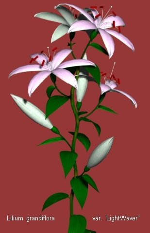 This one really stretched things, not only for my Amiga, but for LightWave itself. I constructed the leaves (6 variations, double-sided), the flowers (4 variations) each with double-sided petals, the stalk, the buds, etc., and when they were all fitted together, the 'Specimen' contained more Points than the 65,536 LightWave5 allows for a single Object. I was about two-hundred over and the system rejected the Object! Luckily, each bud contains 'hidden' anthers and a stamen, which are only needed for the animation. The buds 'open' up you see. So, any buds not opening don't need their internal organs. Deleting these from a single bud pulled things into line.