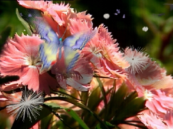 The out-of-focus birds and small butterflies disappear 'behind' the flowers and foliage in the movie. This effect was achieved using alpha channel masks, which I had to construct in Modeler to match as near as possible, the shape of the flower petals, etc. Using alpha shadowing, it's also possible for the animated characters to 'cast shadows' on selected areas of the original photograph.