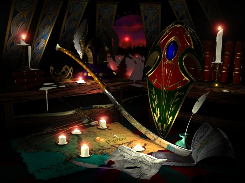 The scene is supposed to depict Hadhafang, the fabled sword of Elrond the Elven King (Ref: 'Lord of the Rings' by JRR Tolkien). Here is Elrond's tent, early morning. In the distance, Mordor and Mount Doom. The Elves and other tribes in The Last Allience will attack today. The note (in Elvish) reads: 'The attack on Mordor starts at six sharp. Remember to wear clean underpants. Regards, JRRT'.