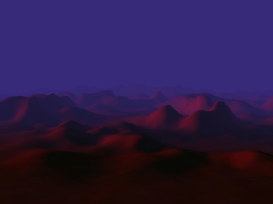 I applied a simple red Surface colour to the sheet and added some blue-grey fog. A red light source off screen left gives the impression of sunrise. This is sunrise on Dune. Thumping good eh?