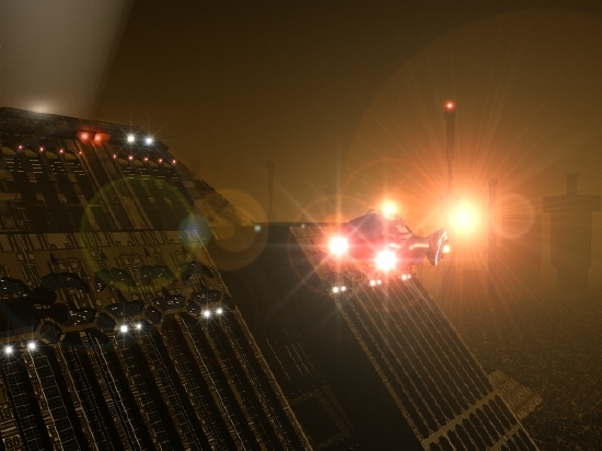 Gorgeous! Blade Runner, a masterpiece of cinematography from Ridley Scott. This still is taken from the files supplied with LightWave4/5 and shows Deckard (in the transporter) en route to the Tyrell HQ. OK, not mine, but I had to include it for its sheer evocation. The original Scene file is set to Widescreen to capture the grandeur of the movie. Here, I've rendered it in standard format to get more of the data in at top and bottom. This fly-by animation contains no less than 57 light sources, about half of which are visible here.