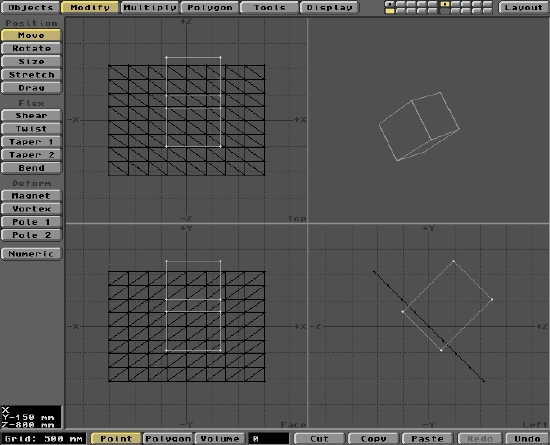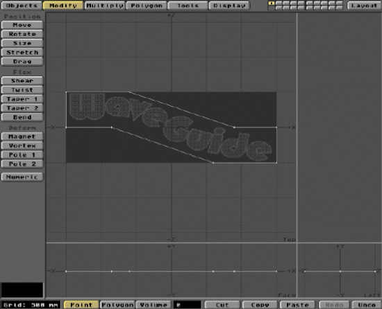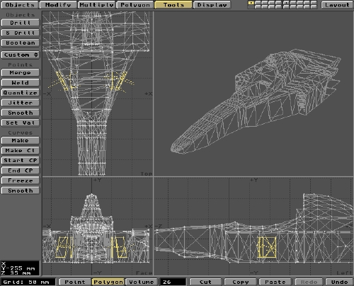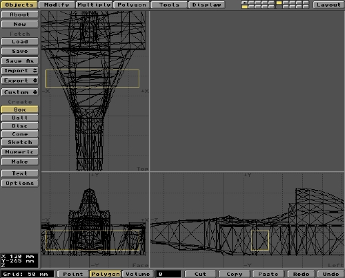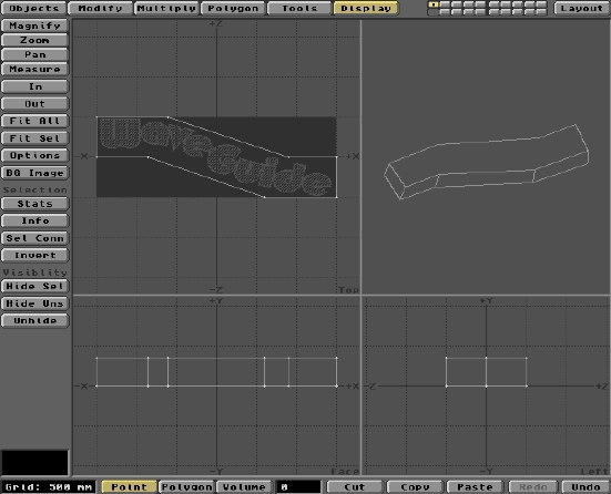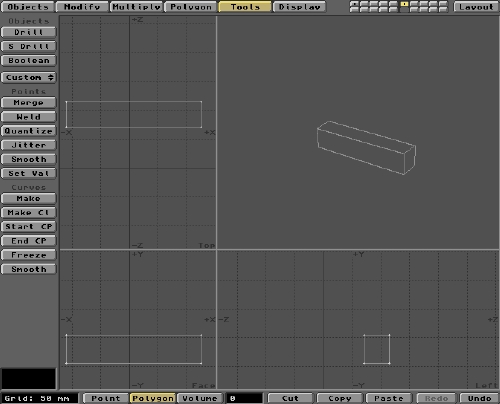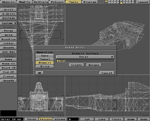 You'll remember that the Drill used to stencil the outline of the decal must be an enclosed solid, so the next step is to extrude the polygon along the Y axis to make a sort of kinky box. This gives us the required Drill as shown here....