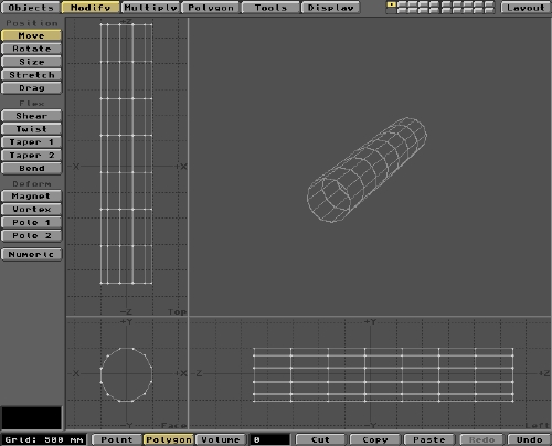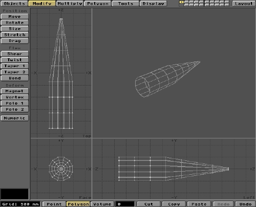 First, let's give the cylinder more of a shark body shape. Let's taper it from about half way along to the tail. This is easily done using the Taper1 tool, but you have to be a little careful. First, select all the polygons in the tail half of the cylinder. Now go to the Face view window and place the cursor on the centre of the circle (it should be the axis origin). With the LMB, drag the cursor to the left. You should see the tapering take place. The far end will begin to close, but don't close it completely, leave a small circle. Note that if the original cylinder is not centered on the origin, the Taper will become asymmetric. Use the Undo button if things go wrong. Here's one I made earlier.