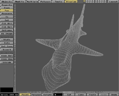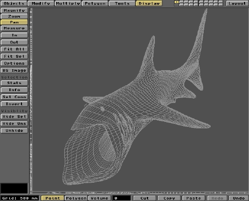 In case things go haywire when you start working on the body, Save the cylinder under a suitable name, say 'shark1.lwo'. Get into the saving habit. It will avoid a lot of grief and frustration! Better to save umpteen preliminary models than create a work of art and lose it accidentally - it happens so easily.