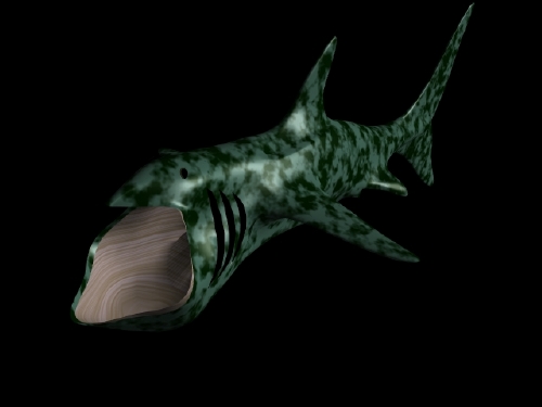 If you can't be bothered creating your own Basking Shark mesh, you can download mine (155K) by clicking here. It may need a minor adjustment to the tail fins (I noticed some small 'holes' in the render). The surface textures I have used are included in the archive. When this is unpacked, open the 'Surfaces' directory and copy the two files it contains into your 3D/Surfaces or NewTek/Surfaces directory, according to the version of Lightwave you are running.