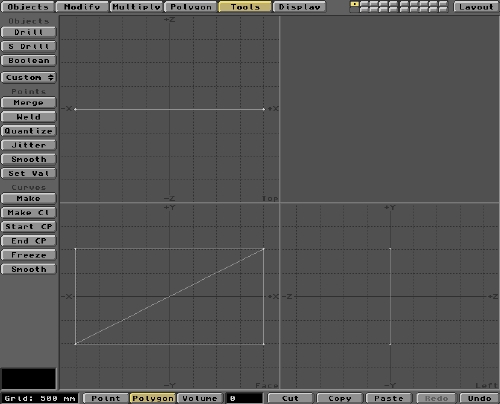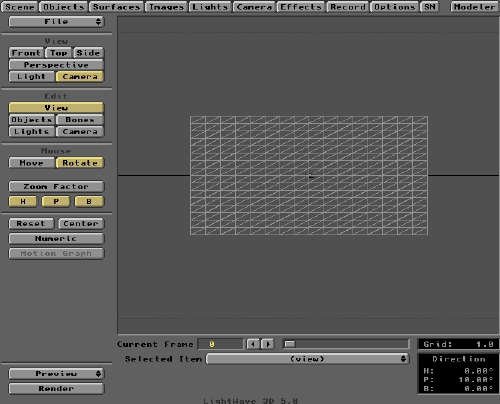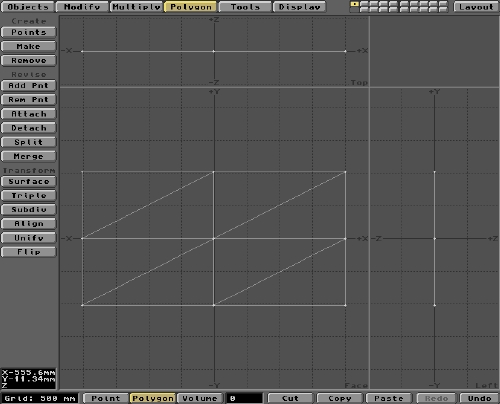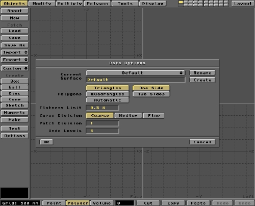 OK, pop over to Modeler and we'll create the Flag Object. There are a couple of ways to create the basic rectangular shape of the flag. You could establish (Make) Points at each corner location and then Make these into a rectangular polygon using the Polygon menu. You would do this after first selecting the Points in a clockwise (or anti-clockwise) order. If you wanted an irregularly shaped flag, using a large number of peripheral Points, this may be the best approach. For a regular, rectangular flag, the quickest method is to create a flat Box Object. The Box is a native Object format located within Modeler under the Objects/Create/Box buttons. But before we do any creating, let's make sure that the Polygons we generate are appropriate to the job in hand.