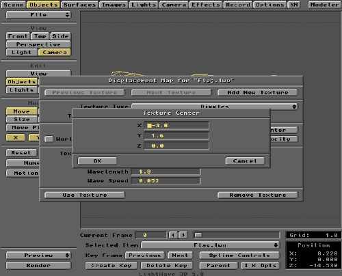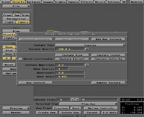 The next thing to do (if you haven't done it already) is set up the Ripples texture for the Flag.lwo. Go back into the Objects panel and click the Displacent Map button as described earlier. The pop up panel allows you to set the various Ripple parameters we've already considered.