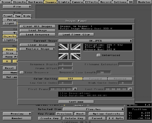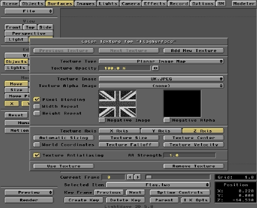 Other parameters to note are the Height Repeat and Width Repeat buttons. Deactivate these so you won't get any wallpapering of the image. The image must fit perfectly over the flag surface in 'one go'. Ensure this by clicking the Automatic Sizing button. LightWave will then stretch any image to fit the Surface if necessary. Making the flag the same size ratio as the image will avoid this, of course.