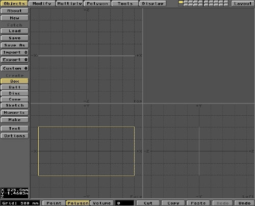 OK, now that's sorted, click the Box button. This puts the cursor into Box creation mode, so you can now draw a suitable Box outline in one or other of the View windows using the LMB. Logically, the outline of our flag should be seen in the Face window. I've dragged out a 2x1 rectangle 'cos that's the shape of the Union Jack image I intend to use on the flag surface. (There's more on the sizing aspect later.) You don't need any other dimension to the Box, so the other View windows show a simple line. The Box has no depth, it's just a flat plane.
