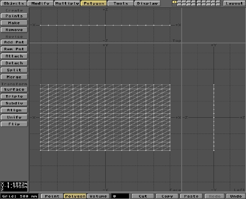 However, there are still not enough Polygons in the Flag Object to render a smooth, wavey surface. So, Subdiv a couple more times. More if you want to achieve a really smooth result. You should get something like the folowing graphic. Here, there are 512 polygons, but you may end up with many more. If so, be sure you have plenty of RAM and a fast processor! You can check the number of Polygons using the Stats button under the Display menu.