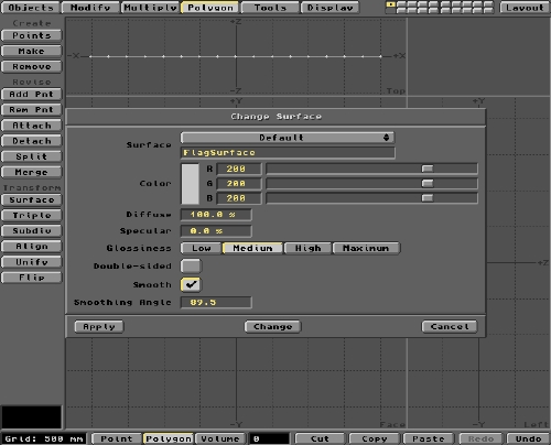 OK, I reckon this is good enough for an animation sequence. The next thing to do is to assign a suitable name to the flag's surface, so we'll recognise it when everything's transferred to Layout. Naming a Surface requires the area in question to be selected. However, since ALL our flag surface will have the same name, just go straight into he naming procedure. (The logic behind this is that LightWave considers ALL the Polygons to be selected if NONE are selected before the operation. Think about it!) You do the naming under the Polygon menu. On the left hand side, you'll see a button labelled Surface. Click this to pop up the Change Surface panel, shown below.